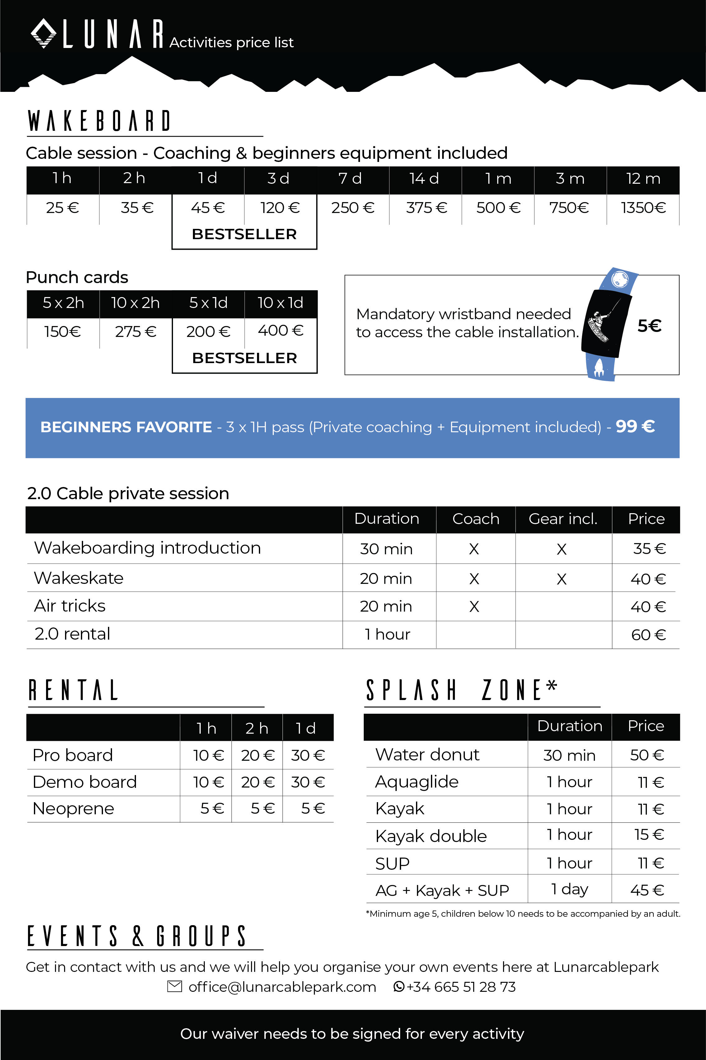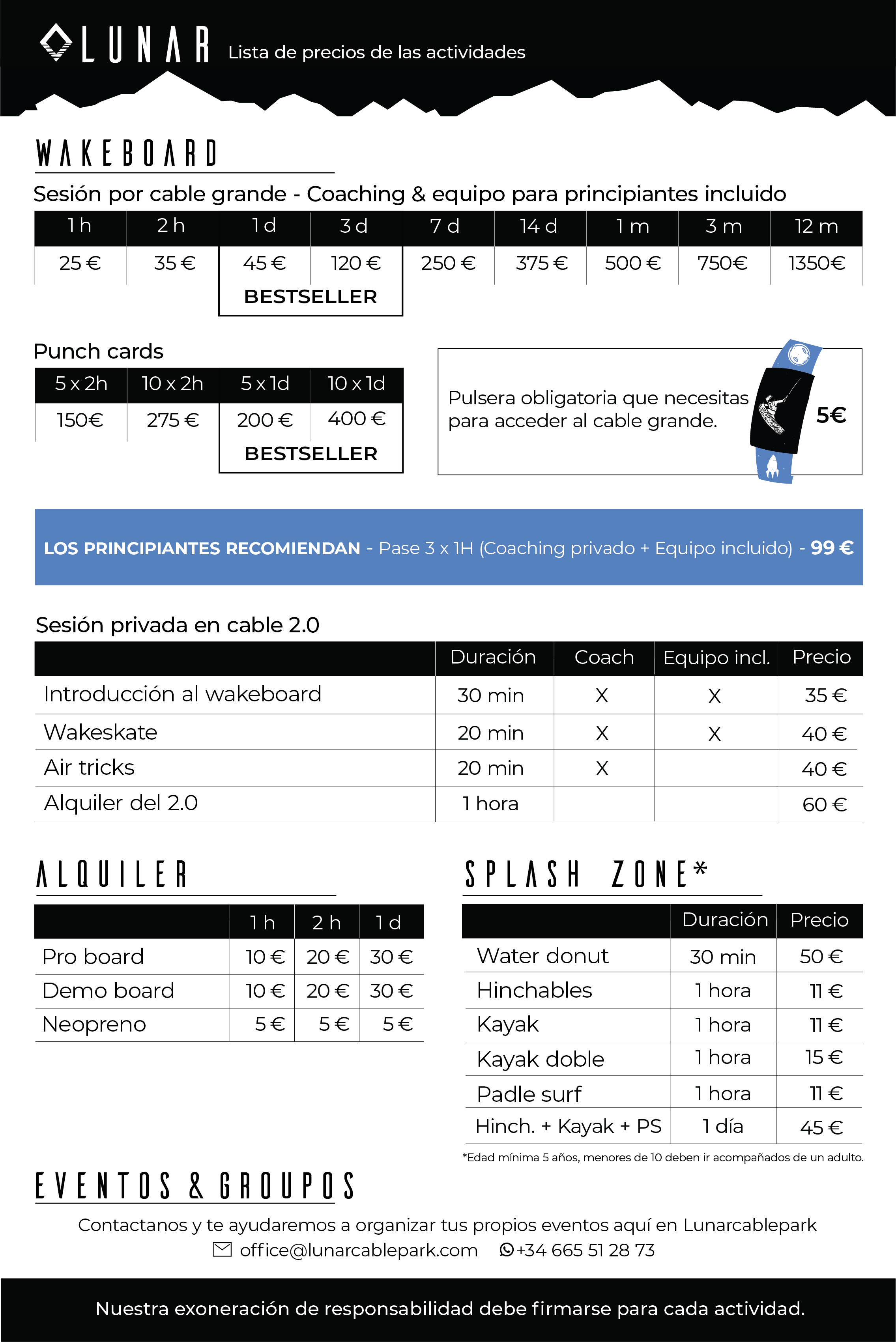 Elige el plan que mejor se adapta a lo que buscas y disfruta de una experiencia única en las mejores instalaciones de Wakeboard en España.